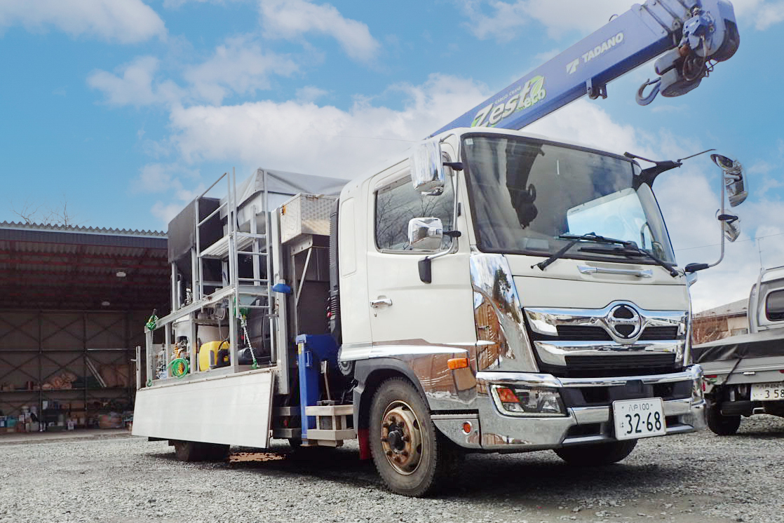 トラックで輸送できる小型移動式プラントを導入し、即日規制解除したい伸縮装置取替工や大型トラックではアクセスしにくい狭所での3時間で強度発現する超速硬コンクリートを供給。